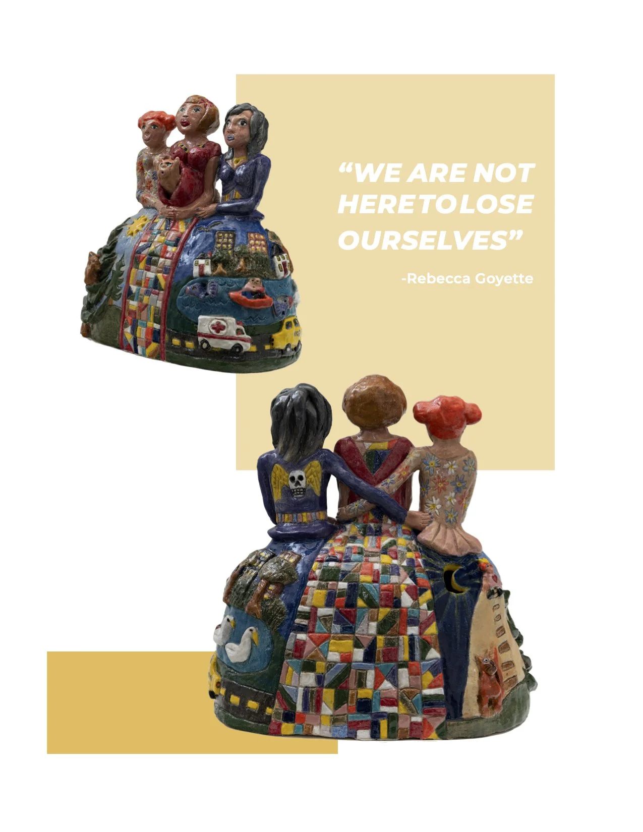 The Triple Goddess is the merger of the mother, maiden and crone. In Goyette’s version, realized in ceramic, the viewer bares witness to a self- portrait entwined with the artist’s mother. Imagining the dyad in triplicate, the sculpture binds the figures both by history and present: the landscape of the maiden is the artist’s childhood backyard, the mother is represented by a quilt pattern, the crone by Goyette’s mother’s view from her new home in New York City. The work undoubtedly captures the artist’s feelings about generations and ancestry, while reconciling this past with her present.